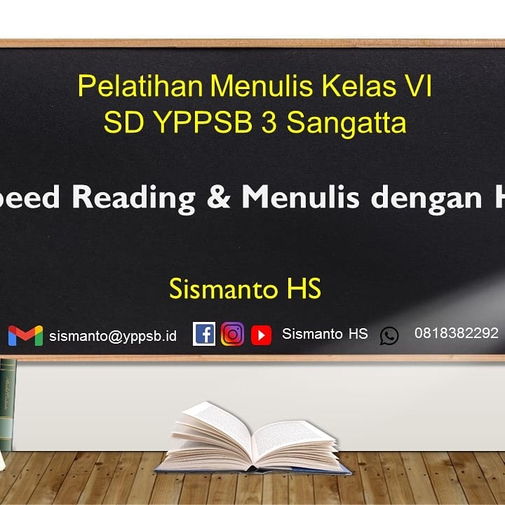 Hari ini saya diminta panitia untuk memberikan materi "speed reading dan menulis dengan hati" secara daring kepada anak-anak kelas 6 SD YPPSB 3 Sangatta yang merencanakan membuat sebuah buku dengan tema dinamika pelajaran dalam pandemi covid 19.
